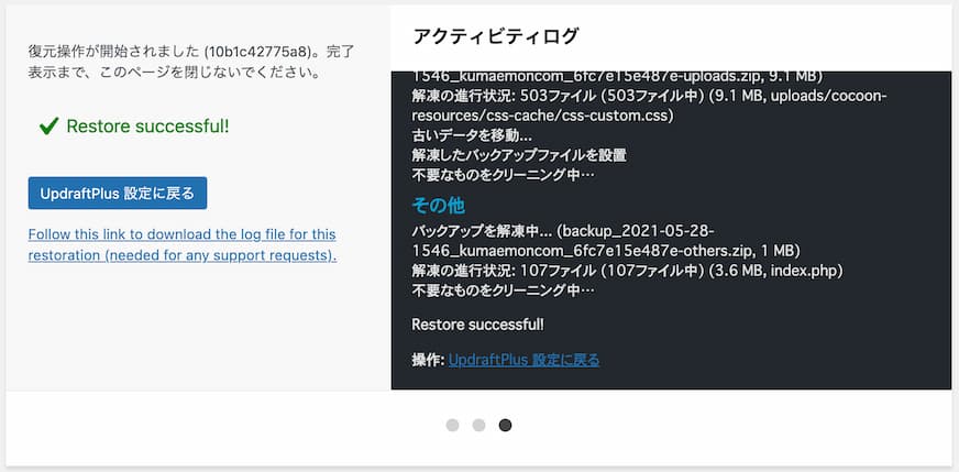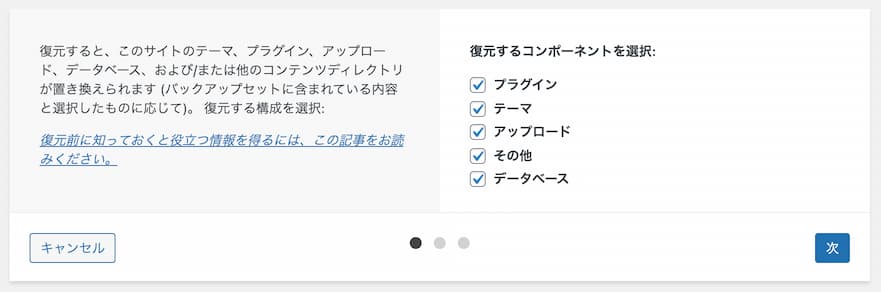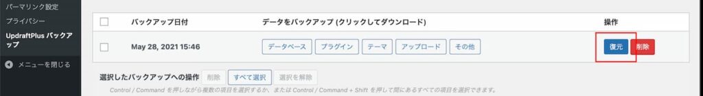 アップロードしたバックアップの「復元」をクリック。