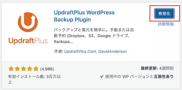 「UpdraftPlus」の「有効化」をクリック。