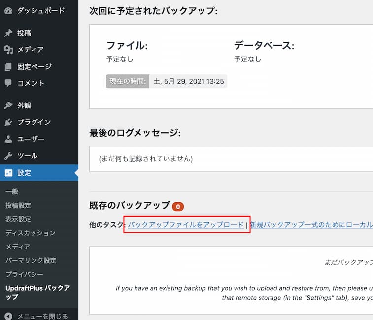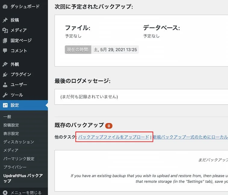 「設定」の「UpdraftPlus バックアップ」にある「バックアップファイルをアップロード」をクリックし、バックアップファイルをアップロードします。