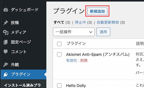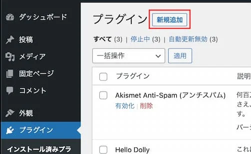 WordPress の左サイドのメニューから「プラグイン」し、「新規追加」をクリック。
