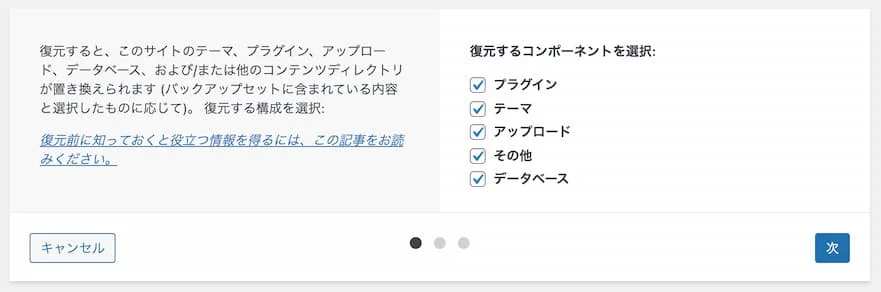 「復元するコンポーネントを選択」を全て選択して「次」で進めていきます。
