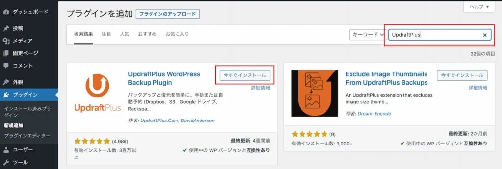プラグインを検索するテキストボックスで「UpdraftPlus」を検索し、見つかった「UpdraftPlus WordPress Backup Plugin」の「今すぐインストール」をクリック。