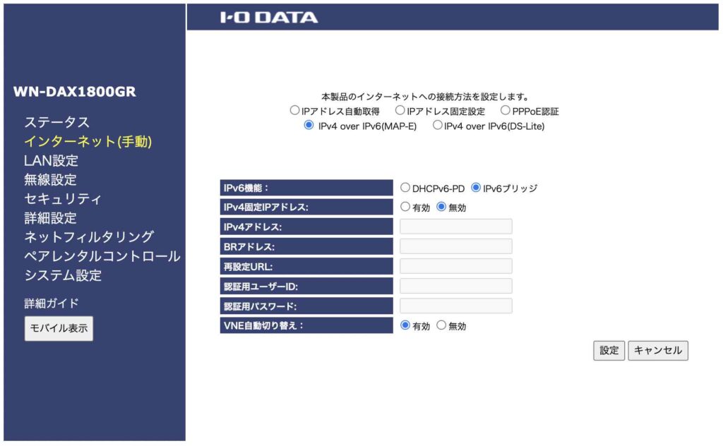 「IPv4 over IPv6 (MAP-E)」に変更。