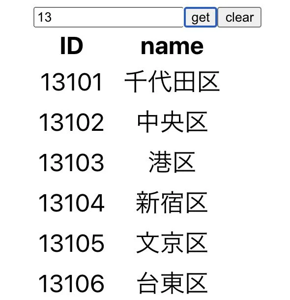 REST API は「国土交通省 総合情報システム」が公開している「都道府県内市区町村一覧取得API」で試しました。