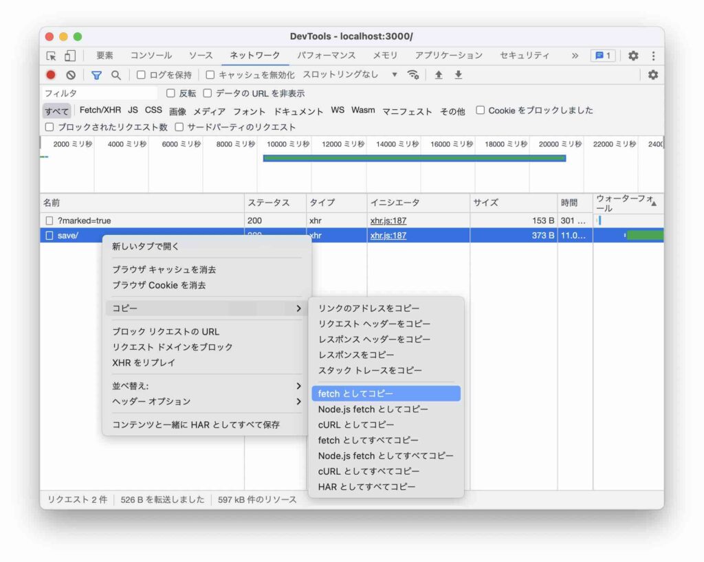 実行した API を右クリックして「コピー」-「fetch としてコピー」を選択すると、実行する API をコードで取得できます。