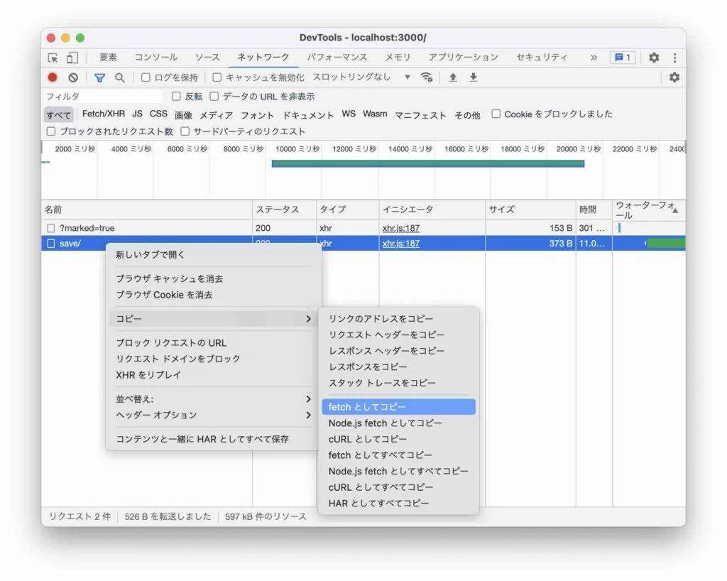 実行した API を右クリックして「コピー」-「fetch としてコピー」を選択すると、実行する API をコードで取得できます。