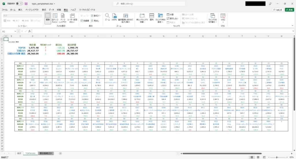サンプルシートが公開されているので、「TOPIX100構成銘柄サンプルシート」で試してみます。