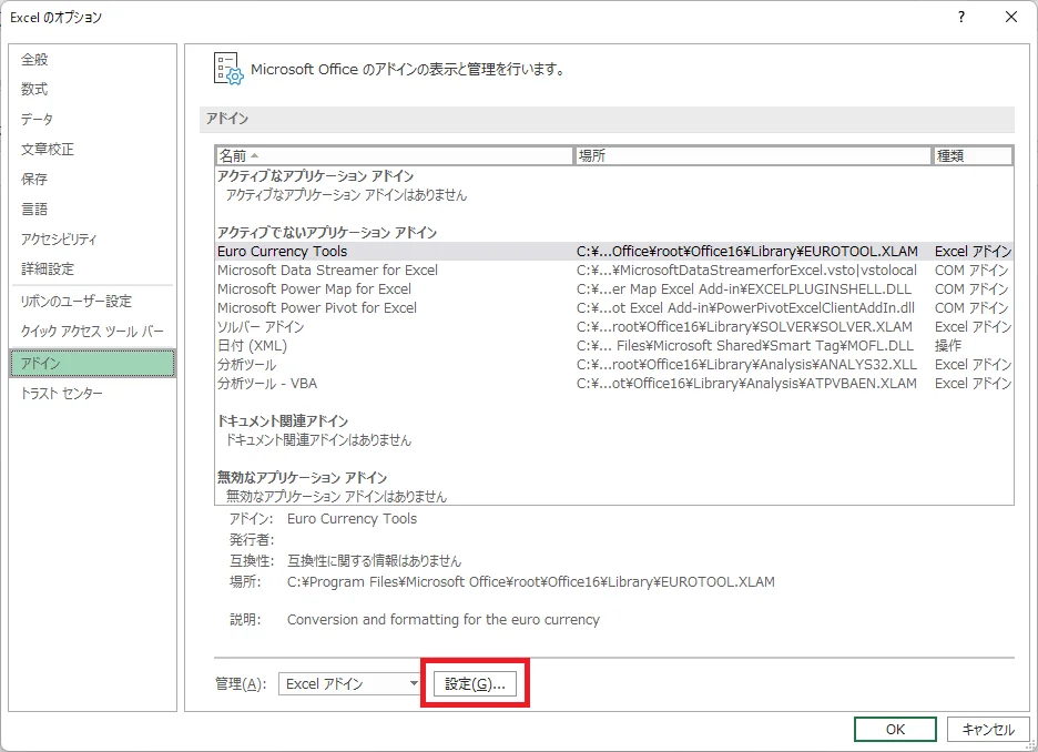 2. 「Excel のオプション」の「アドイン」で「設定」を選択します。