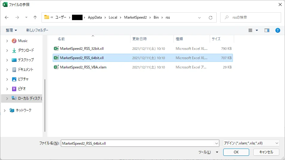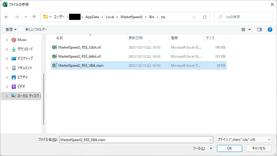 6. 「MarketSpeed2_RSS_VBA.xlam」を選択します。