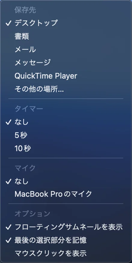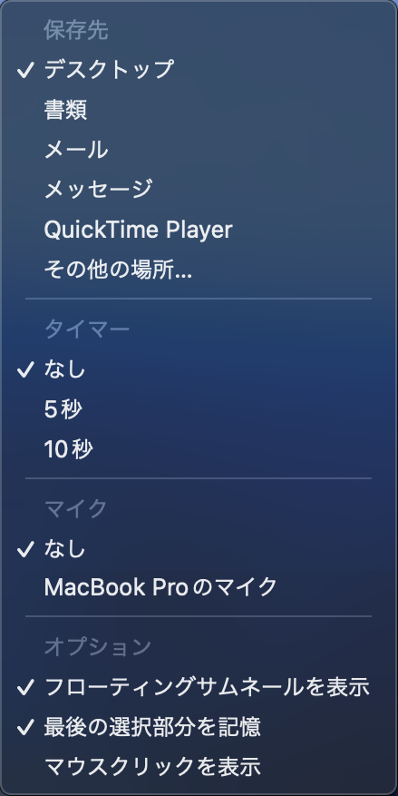 ディスクトップではなく、別の場所に保存されるようにするには「スクリーンショット」アプリの「オプション」で設定します。