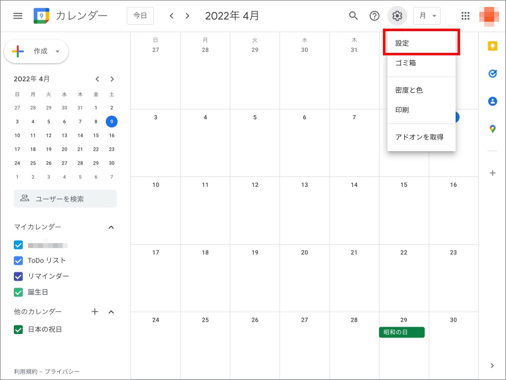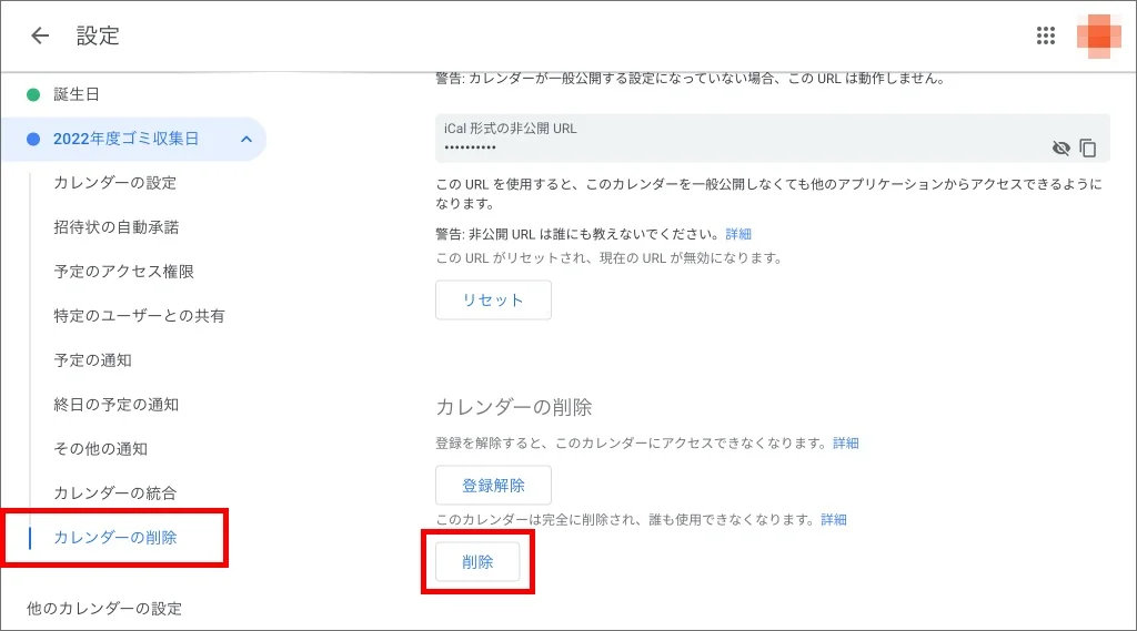 「設定」から対象カレンダーの「カレンダーの削除」をクリック