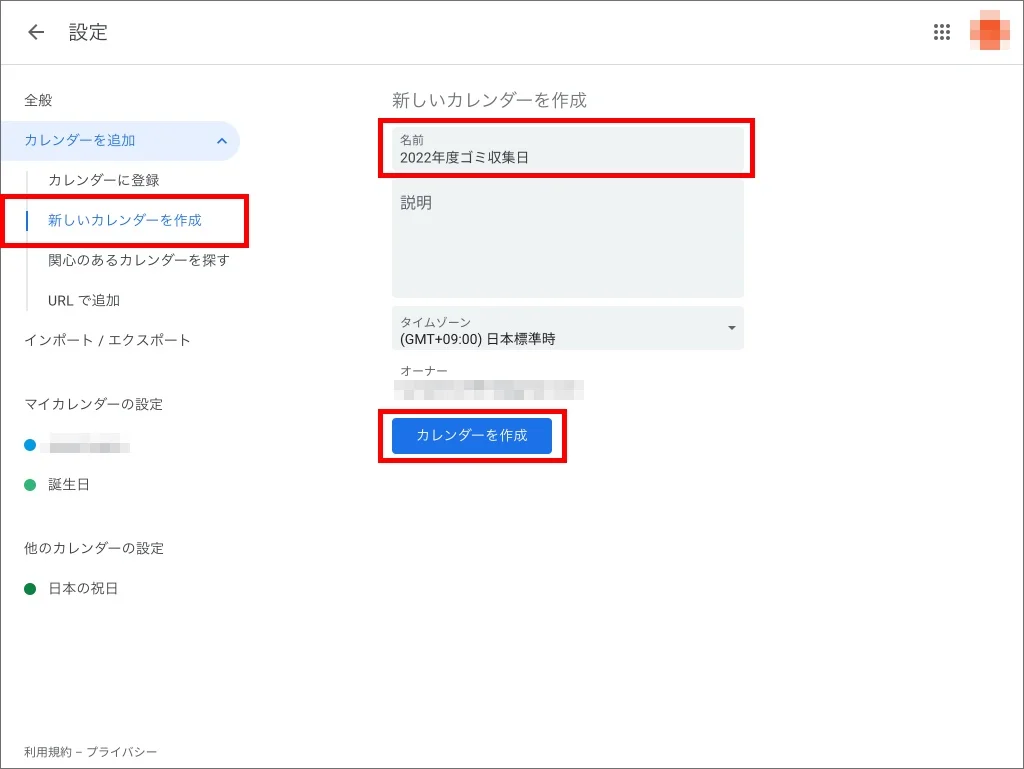 2.「カレンダーを追加」-「新しいカレンダーを作成」をクリック