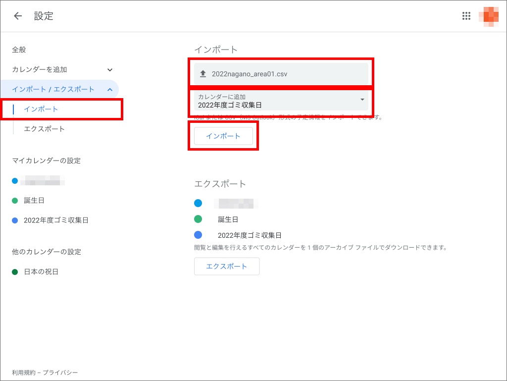 ゴミ収集日の CSV ファイルを作成したので、Google カレンダーに読み込ませます。
