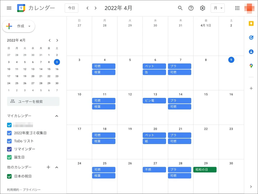 「マイカレンダー」に追加したカレンダー「2022年度ゴミ収集日」があります。