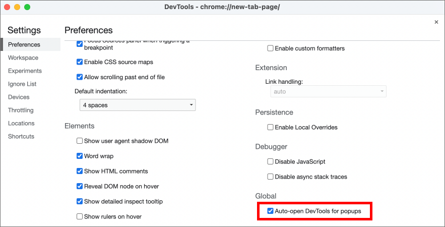 その場合、DevTools の「Setting」-「Preferences」にある Global の「Auto-open DevTools for popups」にチェックを入れれば OK です。
