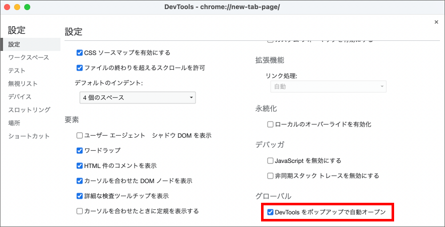 日本語にしている場合は「DevTools をポップアップで自動オープン」