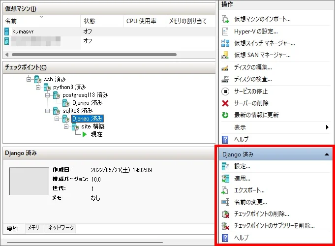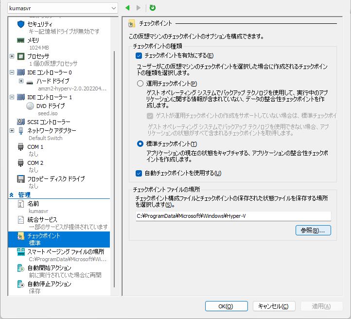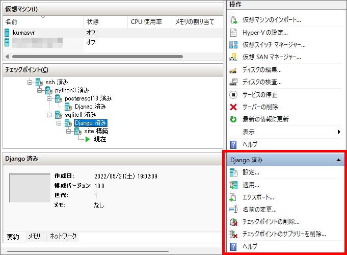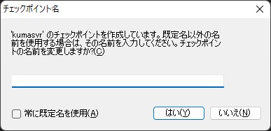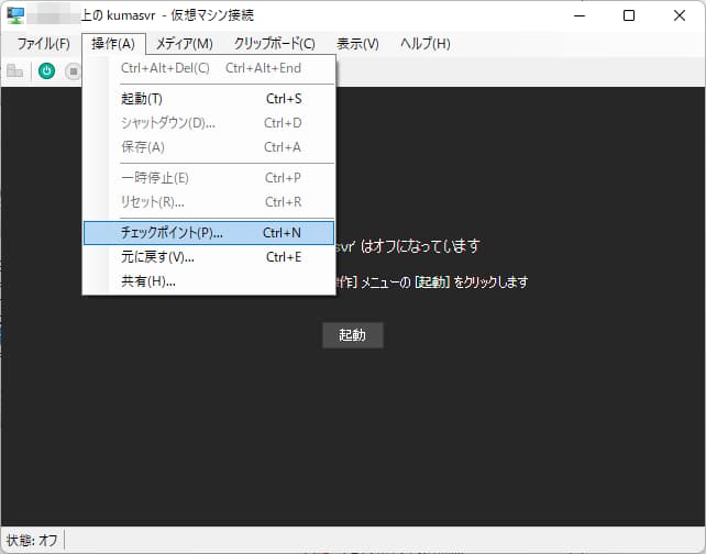 チェックポイントは、仮想マシンをシャットダウンした状態で作成するようにしています。