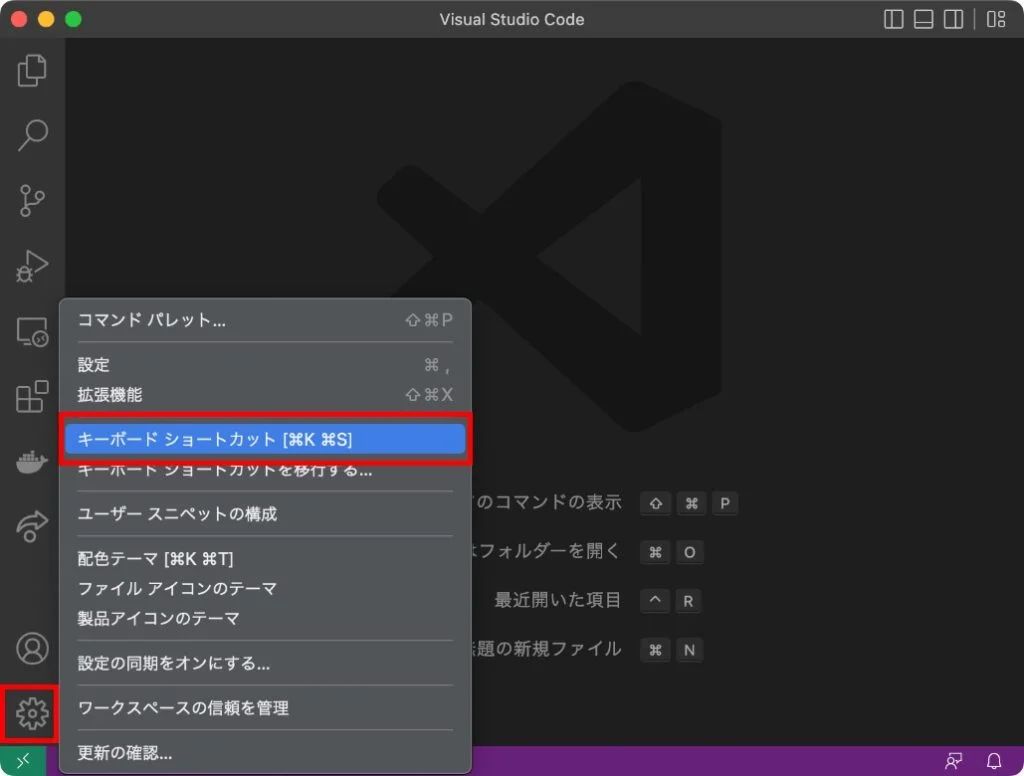 左下の「管理」のアイコンをクリックして「キーボード ショートカット」を選択します。