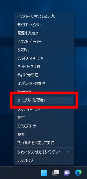 - スタートメニューを右クリックして、メニューから「ターミナル(管理者)」を選ぶ