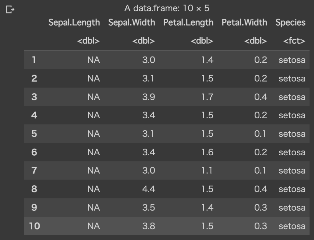 iris の偶数行の Sepal.Length が NA なデータを作成