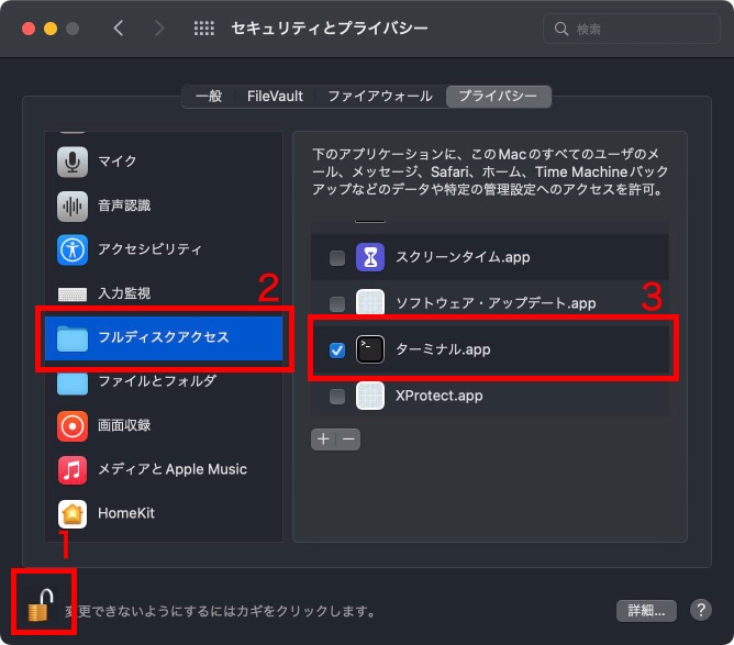なので、ターミナルにフルディスクアクセスを許可しました。