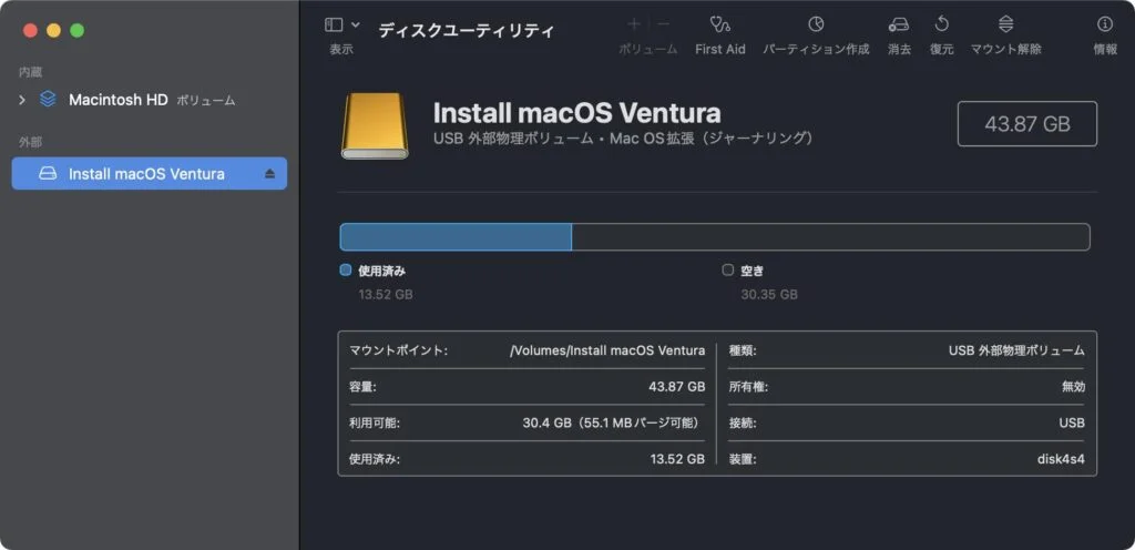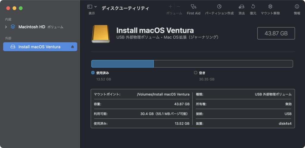 自分は “usb” というボリューム名で USB メモリを用意しました。