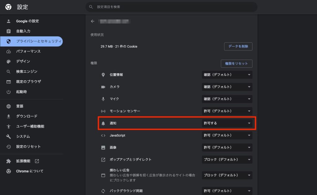 設定 → プライバシーとセキュリティ → サイトの設定 → 通知