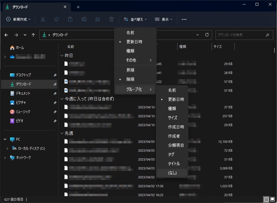 Windows:ダウンロードフォルダーの表示を期間で分けない