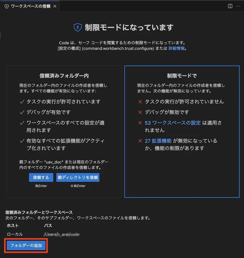 試作のワークスペースを作る度に信頼するか聞かれるのが厄介なので、信頼するフォルダーを決め、そのサブフォルダーに試作物を作成することで聞かれてこないようにしました。