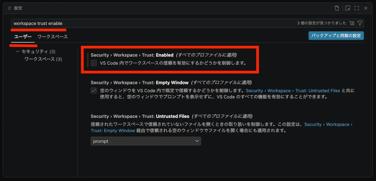 「設定」から「ユーザー」タブを選択した状態で「workspace trust enable」と検索すると「Security > Workspace > Trust: Enabled」の項目が出てくるので、チェックを外します。