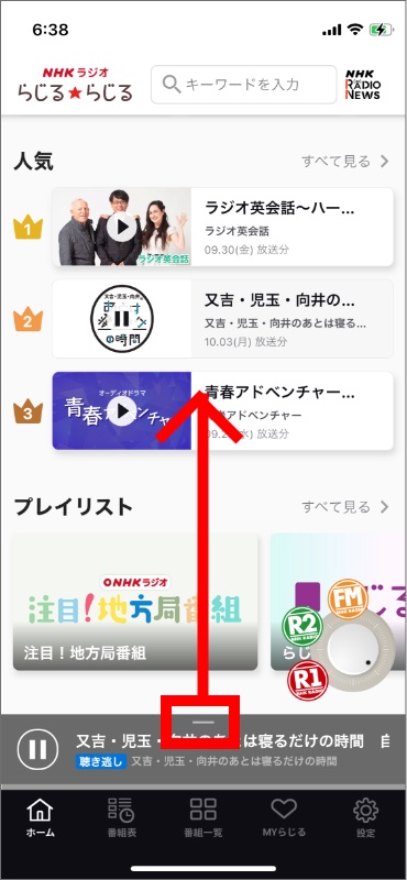 1.再生中の番組の赤枠で示す箇所を、上にスワイプして広げる