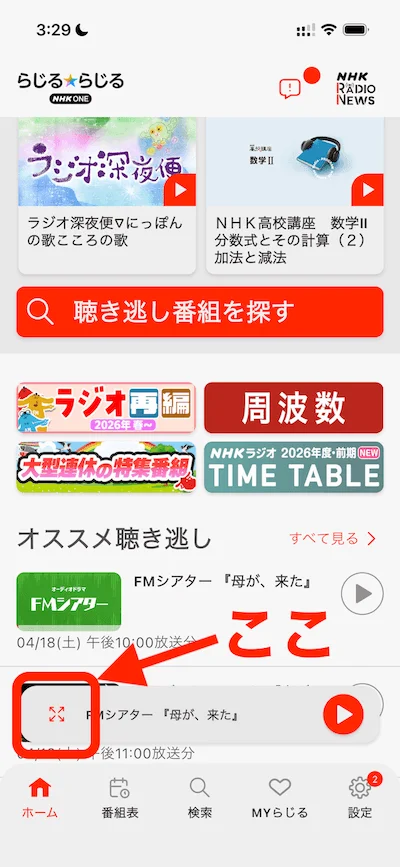 1.再生中の番組の赤枠で示す箇所をタップして広げる